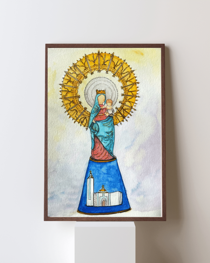 La respuesta llegó con una acuarela: la Virgen del Pilar con el Niño en brazos, protectora y cercana, acogiendo en su manto la arquitectura de la parroquia. Uniendo lo visible con lo invisible, lo cotidiano con lo eterno. La figura de María no solo evoca la tradición y la devoción, sino también el abrazo de un hogar espiritual que siempre acoge.